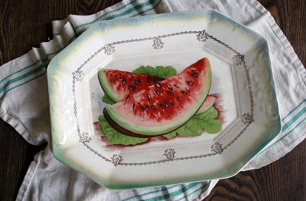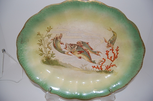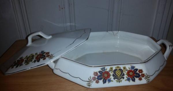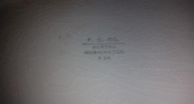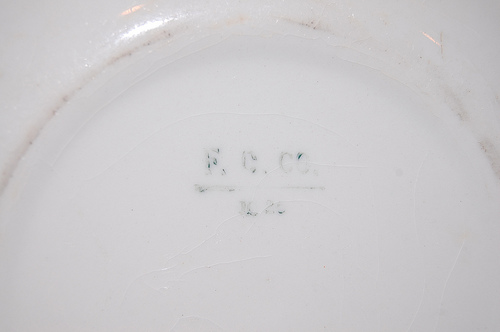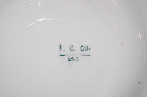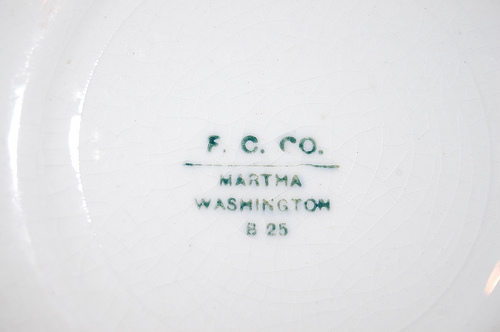 | Patterns included table and toilet ware in white granite and semi-porcelain bodies. Included are 'Greek', 'Kenneth', 'Tiger', 'Pluto', 'Cupid' and 'Lygia'. Backstamps include 'La Francaise, Semi Vitreous' over a Fleur de Lyse, La Francais Martha Washington, F.C. Co. China, F.C. Co. martha Washington, F. C. Co. Victoria, La Francaise Porcelain, |