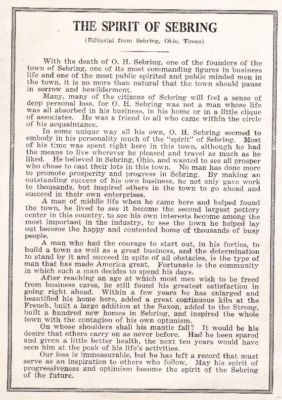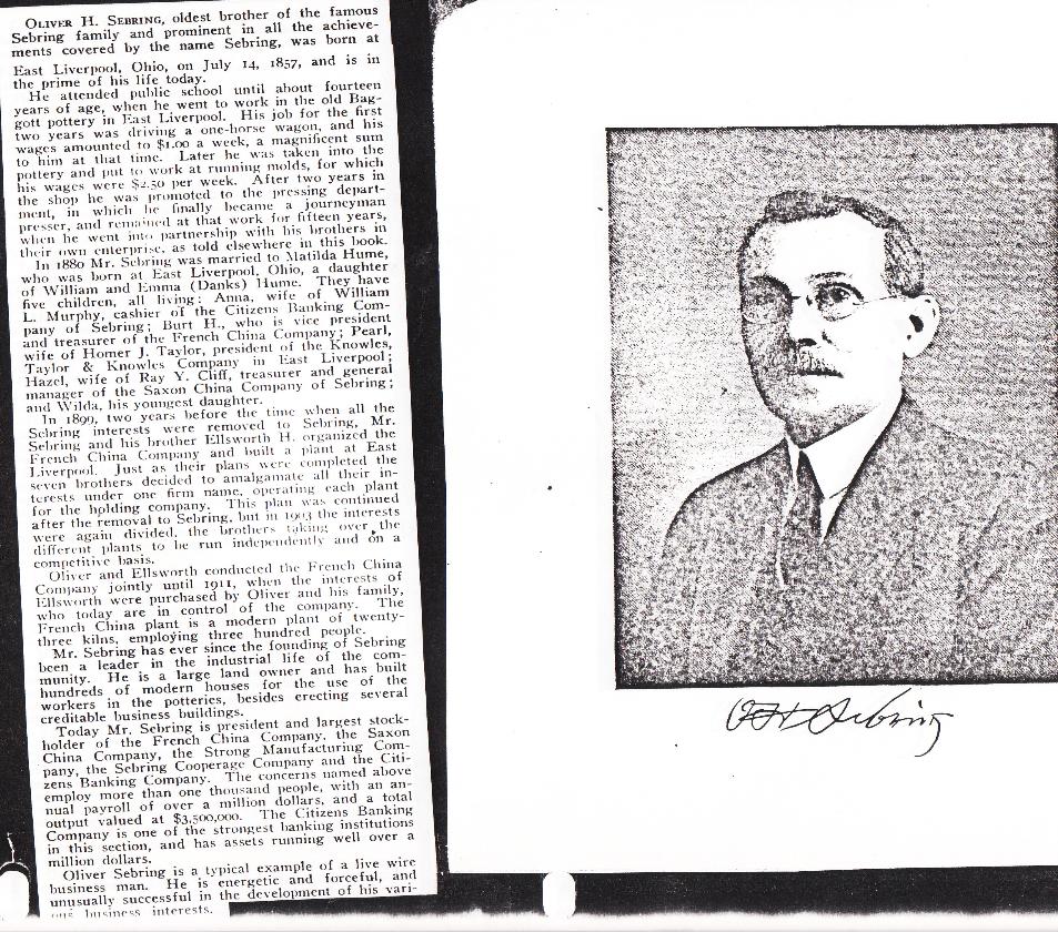 | 1857-1929 Born July 14, 1857 in East Liverpool, Ohio. Oldest of the Sebring brothers. Engineered the purchase of the 200 acres that became Sebring, Ohio. First owned the Oliver China Company, built in 1899 in Sebring, Ohio. George, his brother, soon afterward took over. Also managed the French China Company after Fred sold it. At one time he had interests in Limoges, French China, Saxon China, and the Strong Manufacturing Company. These he merged into the Sebring Manufacturing Corporation. He sold a million dollar bond issue for modernization purposes, which funds were poorly managed. Saxon operated 1911-1932, and was sold to W.V. Oliver in 1934. Founded the Citizen Banking Company and the Sebring Manufacturing Corporation. He also had controlling interest in the Hotel. He was co-owner with his son Bert of the Sebring Cooperage Company. He was president of the National Potters Association. His first residence was |