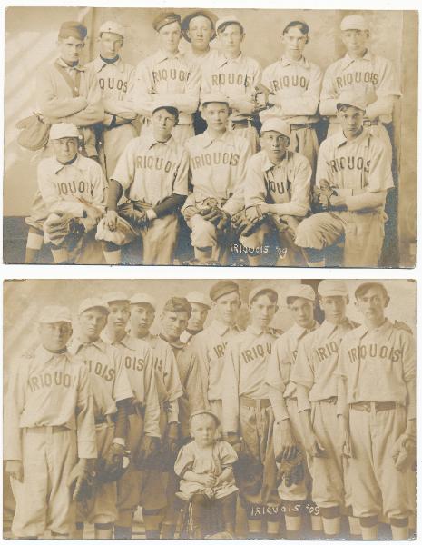 | Here in Atlanta, Georgia we're looking forward to the start of baseball season in a few days (go Braves!) which reminded me of these attached pictures. There of a baseball team my great grand father apparently managed. I haven't been able to find info on the team. Do you think any of the Historical Society members would know about the Iriquois baseball team of 1909? In the first picture my great grand father is in the center back and in the second picture my grandfather at about 3 years of age is sitting in the front. As before you're welcome to use the pictures. Sincerely, John Allen, March 2010 |