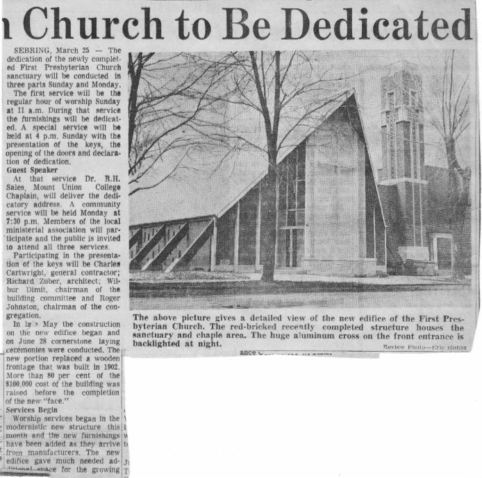 | First Presbyterian Church First services were held at the end of 1900 in the YMCA building, corner of Oregon avenue and 15th street. Approximately 35 charter members requested the Presbytery to establish the church. Once the request was granted, a contract was given th F.D. Shewell to erect a building on two lots donated by the Sebring Land company. The cost of the building was $2,497. It had a furnace, carpet and electric lights, as well as auditorium style chairs. It was dedicated November 23, 1902. At the close of WWI, and in the early '30's new lighting was installed. On April 28, 1946, a re-dedication was held to celebrate a major remodeling of the sanctuary and memorial gifts of a two-manual organ and a set of chimes. The church also received a new kitchen. At the time of the 50th anniversary, there were 360 active members and a church school membership of 135. In 1955, an educational building was added to the existing church building. Also included are a fellowship hall, kitchen, a large lounge furnished by the Women's Association, a nursery, church office and pastor's study. In March, 1965, a new church building was dedicated. This building includes a beautiful sanctuary with a seating capacity of 325, classrooms, a choir room, and a chapel. Due to a loss of membership, in June, 1974 it was decided to merge with the Faith United Presbyterian Church to form the Sebring United Presbyterian Church. |