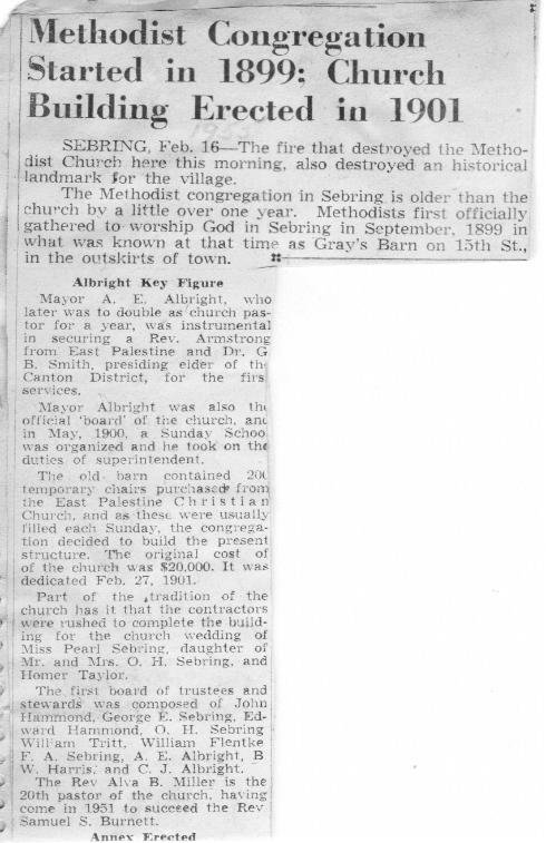 | The first Methodist Church services were held in September 1899. A.E. Albright was instrumental in having Rev. Armstrong of East Palestine and Dr. G. B. Smith of the Canton district here for a meeting. A congregation of 200 were seated in Gray's old barn. Mayor Albright filled the position of pastor for a year. Albright organized a Sunday school in May 1900. Helped by support of the Sebring brothers, a building committee was formed. At a cost of $20,000, it was dedicated on February 27, 1901. The first wedding was for Miss Pearl Sebring, daughter of Mr. and Mrs. O.H. Sebring and Homer Taylor. The church held 600. Fire destroyed the Methodist Church in March, 1955. It was immediately rebuilt on the same site. Bishop Kearns retired from the active episcopacy in 1976. He then became Visiting Professor at the Methodist Theological School in Ohio. In 1988 he and Alice moved to Copeland Oaks, a retirement complex in Sebring, Ohio related to the United Methodist Church. |
